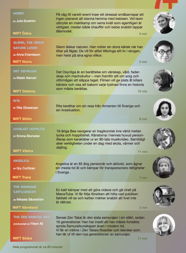 WIFT Dalarna visar åtta kortfilmer från olika delar av Sverige. De bjuder på filmingel och snacks. Kom, mingla och träffa nya och gamla vänner. Alla är välkomna och det är helt kostnadsfritt. Ingen föranmälan behövs, det är bara att dyka upp!